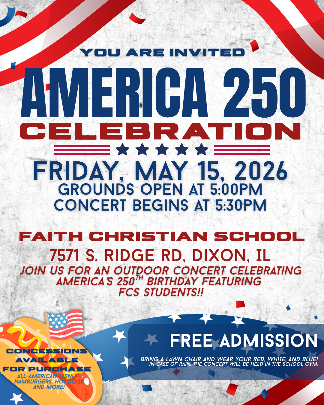 Join us for an outdoor concert celebrating America’s 250th Birthday! Faith Christian School students will be presenting patriotic musical selections. Everyone is asked to wear red, white, and blue and to also bring a lawn chair. The concert should last about an hour. It is free admissions to attend. There will be concessions available to purchase–an All-American menu including grilled burgers and hot dogs. In case of rain, the concert will be held in the school gym. School grounds open at 5:00pm. The concert begins at 5:30pm.