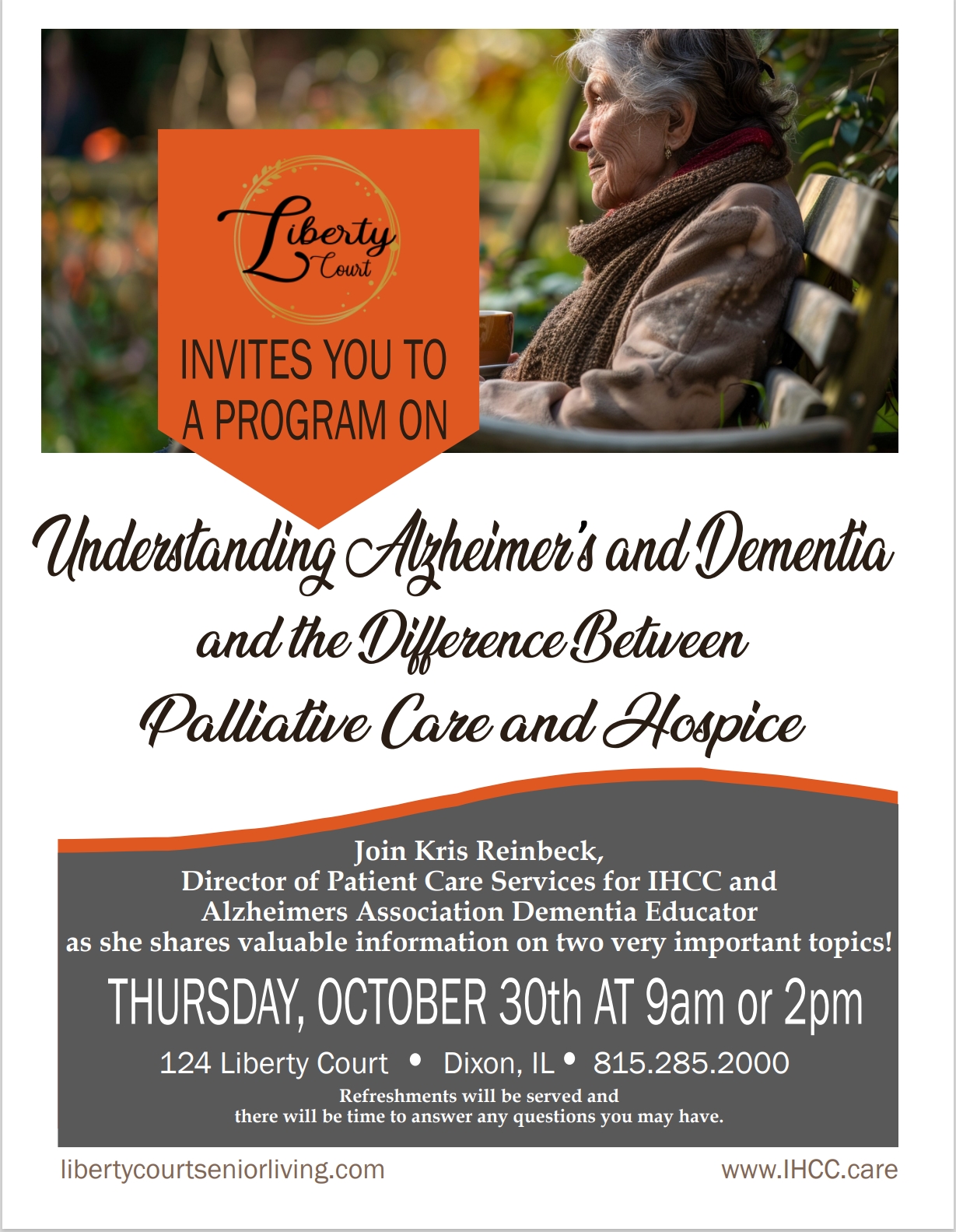 Alzheimer’s Association Dementia Educator will speak on Alzheimer’s and Dementia. She will also cover the difference between Palliative Care and Hospice.