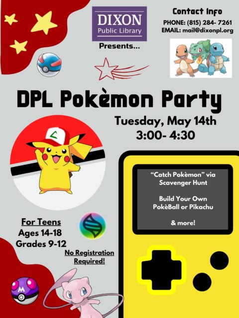 Calling all Pokemon trainers! Join us at Dixon Public Library on Tuesday, May 14th for our very own Pokemon-themed event.…